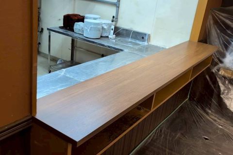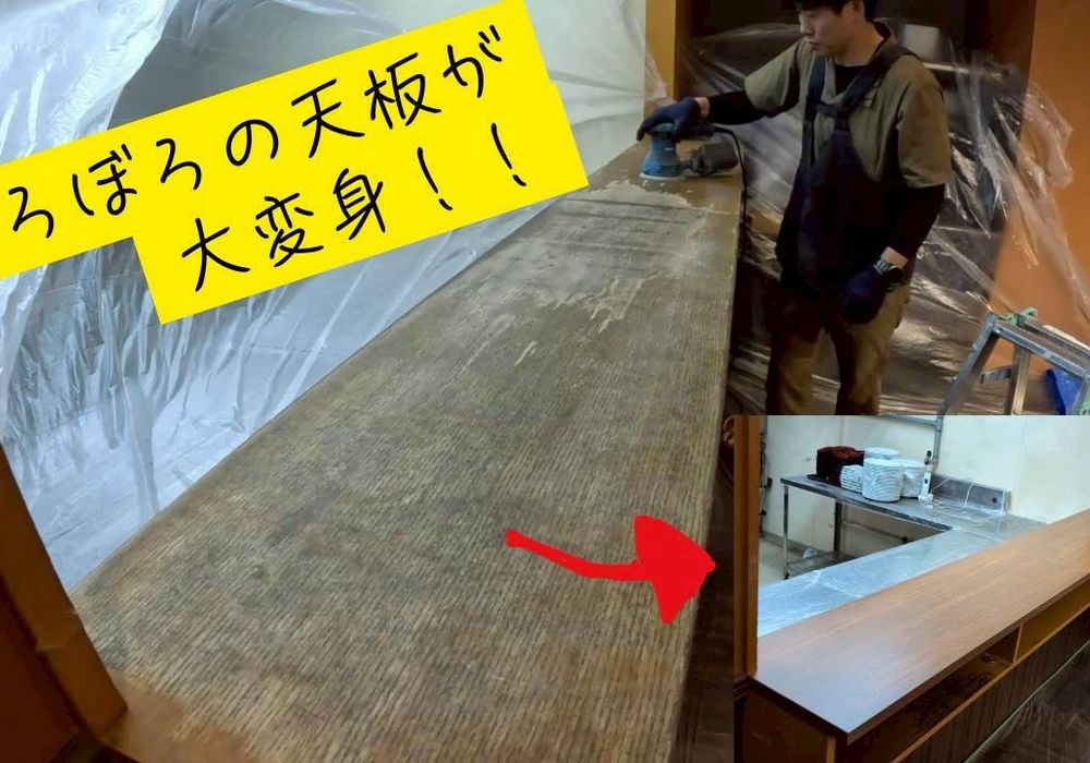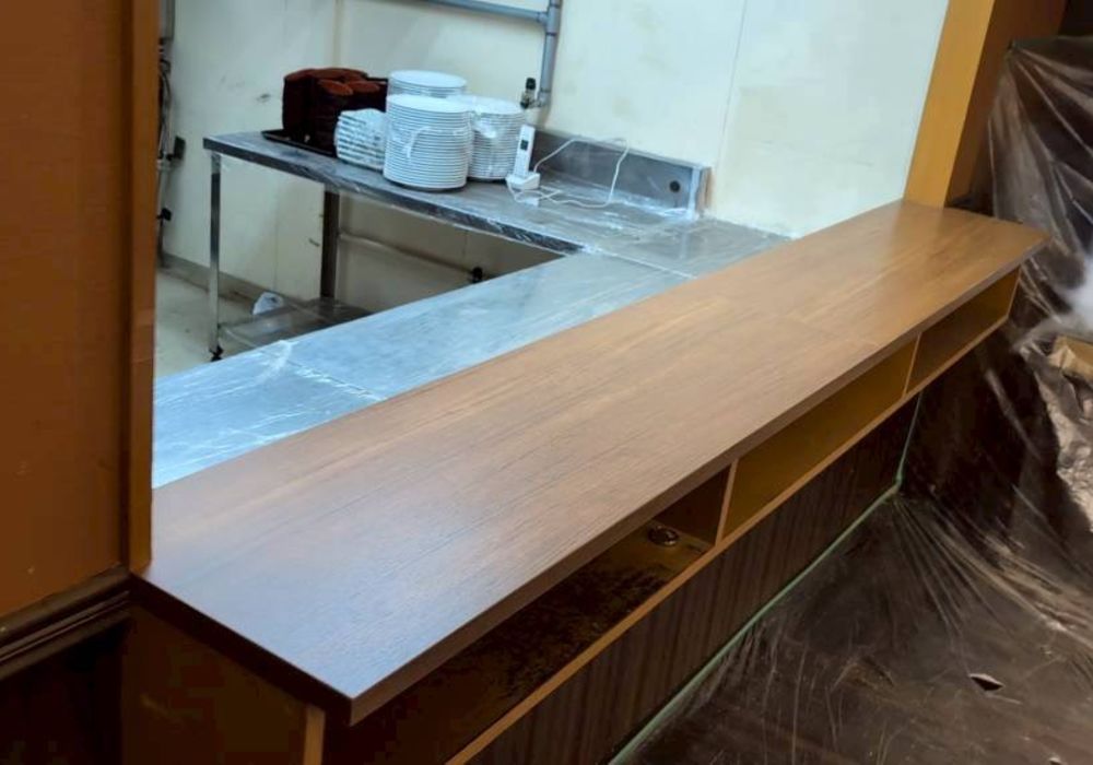 長年の使用で傷みが目立っていたカウンターを、メラミンを上張りすることで美しく生まれ変わらせました。耐久性と清潔感がアップし、落ち着いた雰囲気の中でお食事を楽しんでいただけるようになりました。