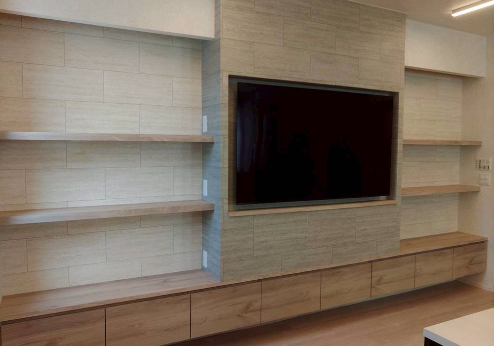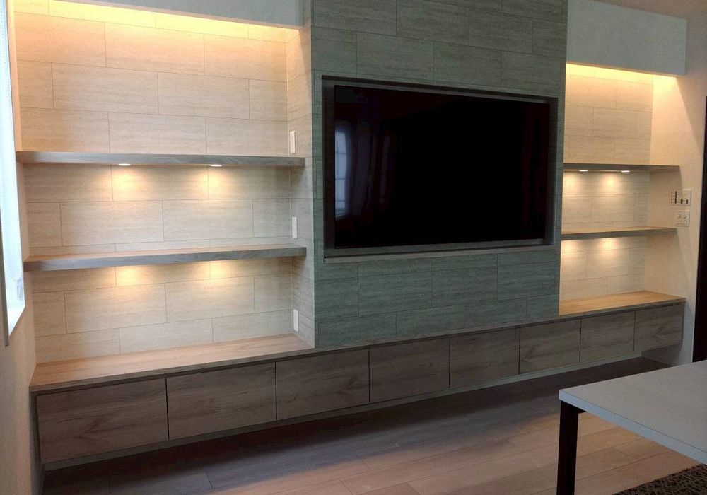壁一面にフロートタイプのテレビボードを造作・設置しました。約20cm浮かせているため掃除がしやすく、奥まで床が見えることで部屋を広く感じさせます。間接照明との相性も良く、より雰囲気のある空間となりました。