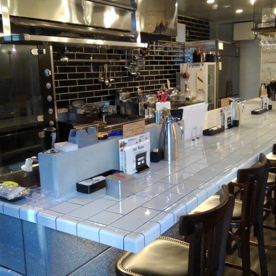 ロティサリーチキン専門店 新装工事を施工させていただきました。 カウンター天板にタイルを張った迫力のあるデザインとなっています。 腰下には石山軟石に間接照明で演出しています。 メインの壁は2色のモルタルで独... -